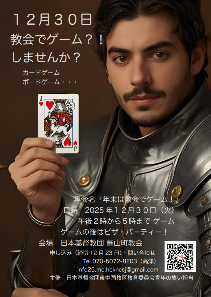 お知らせ 「年末は教会でゲーム!」のお知らせ お知らせ 2025.12.06 12月30日教育委員会主催の『年末は教会でゲーム!』を開催します。蕃山町教会でボードゲーム、カードゲームを中心にたくさん遊び、ピザパーティーをしましょう!年末帰省したけれどどこに行こう、年末暇でしょうがない!といった青年のみなさま(自称青年ももちろん大歓迎!)ぜひご参加ください。お問い合わせは070-5072-8203まで。